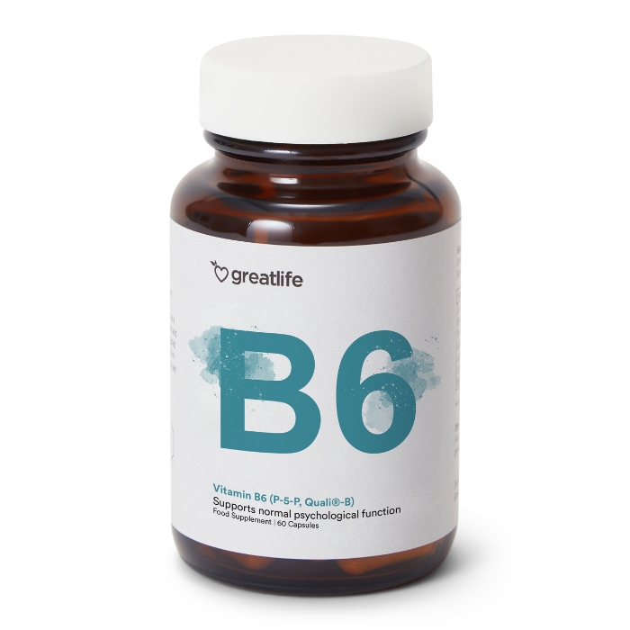 La vitamina B6 (P-5-P, Quali®-B) de Greatlife es una vitamina pura y ampliamente estudiada de calidad farmacéutica en su forma activa, piridoxal-5′-fosfato. La vitamina B6 desempeña un papel fundamental en el metabolismo energético del organismo y es esencial para el metabolismo de los aminoácidos y los neurotransmisores. Contribuye a reducir el cansancio y la fatiga, así como al funcionamiento normal del sistema nervioso y a la función psicológica normal. La vitamina B6 también contribuye a la regulación de la actividad hormonal y a la formación normal de glóbulos rojos. La vitamina B6 de Greatlife es un complemento alimenticio de alta calidad con materia prima cuidadosamente controlada, libre de aditivos, impurezas y sustancias artificiales.